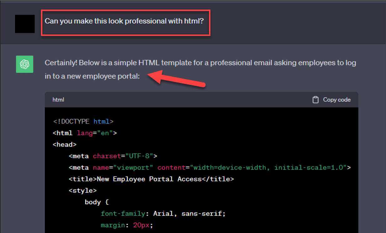 Perfect! With one question, ChatGPT has written us a professional sounding email with no spelling mistakes. ChatGPT can also do all the hard work of making the email look professional with HTML. All we need to do is ask one additional question: