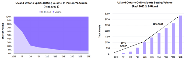 According to ARK’s research, the demand for sports betting remains strong despite the economic downturn, with the total sports betting volume in the US and Canada estimated to have increased by 83% YoY to approximately $117 billion in 2022. The online sports betting segment has shown particularly strong growth, rising from 17% in 2018 to 86% in 2022. ARK predicts that online sports betting will continue to grow at a compound annual rate of 27% in the next five years, reaching $330 billion in 2027, while in-person betting is expected to grow at a slower rate of 11% annually, reaching $27 billion in 2027.