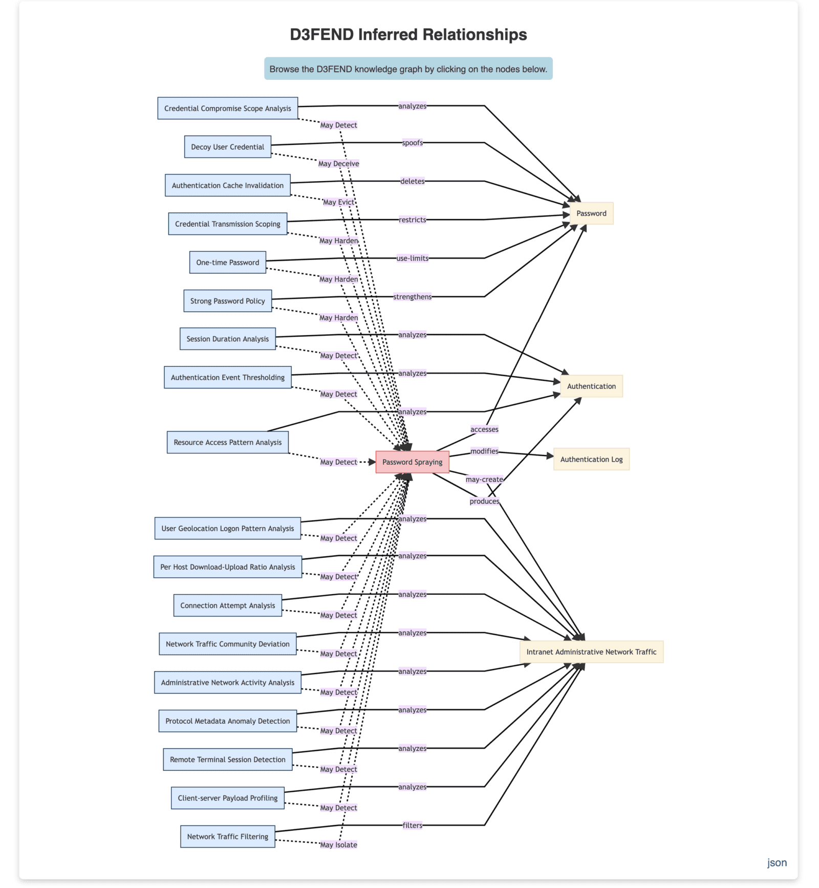 Password spraying tactics are an excellent example of how D3FEND builds upon the intelligence you can gather form ATT&CK. A password spray attack involves the attacker enumerating likely username and password combinations and attempting each combination at any publicly available login. When looking at the technique page (T1110.003) we are presented with three mitigations and two additional detection suggestions. D3FEND™ is where we can turn for more options. At the time of writing, the D3FEND™ entry for password spraying includes a total of 18 defensive controls: