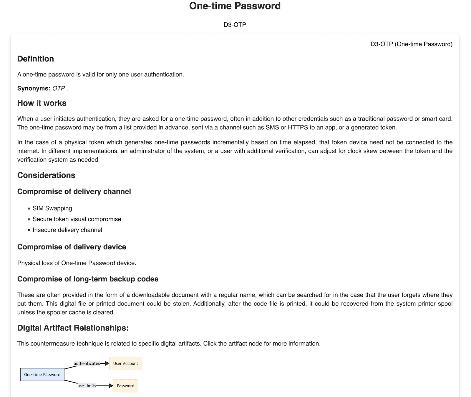 The final section of the detailed view of each defensive technique includes the full inventory of ATT&CK mappings. This is great, especially for visualization in the ATT&CK Navigator so that you can analyze each proposed defensive control against your larger threat model and identify which controls will have the greatest coverage. In this example, we can see that implementation of One-time Passwords (OTP) can not only help harden our environment to prevent a successful password spray attack, but this can also help mitigate the risks of several privilege escalation and persistence techniques that rely on similar attacks meant to discover valid user credentials.